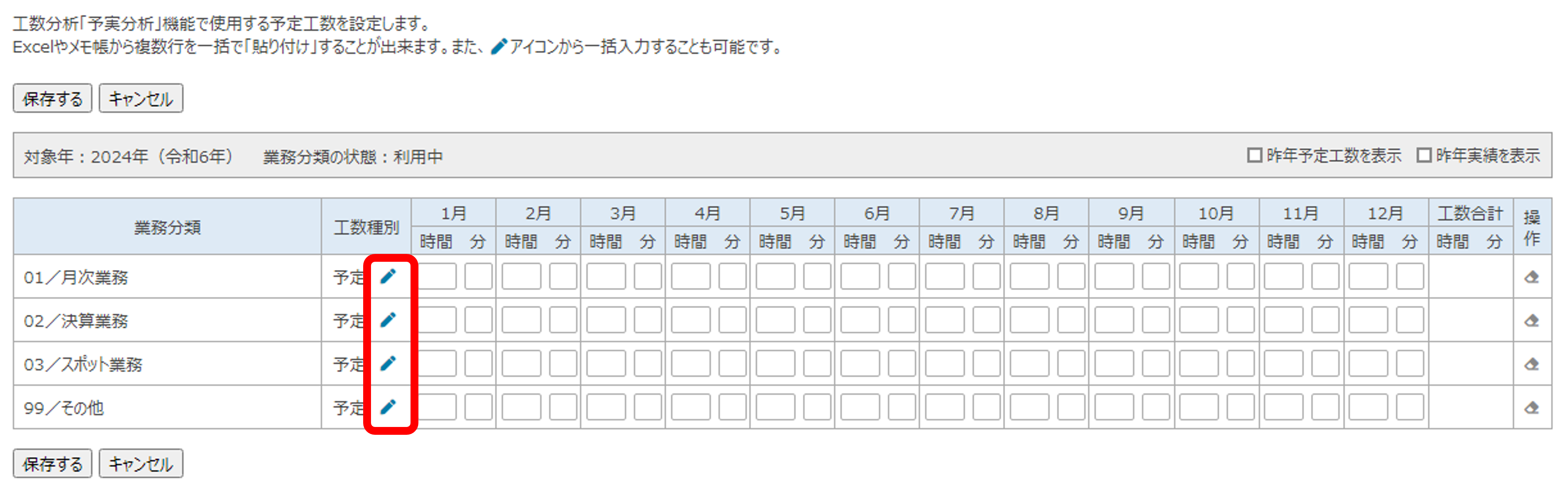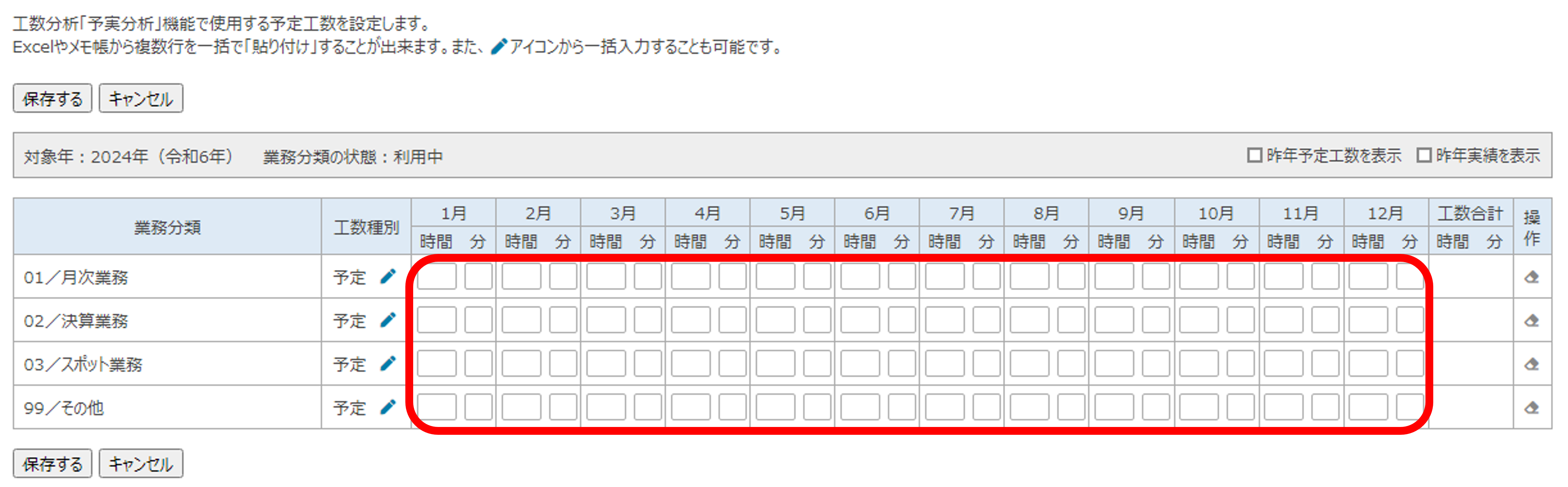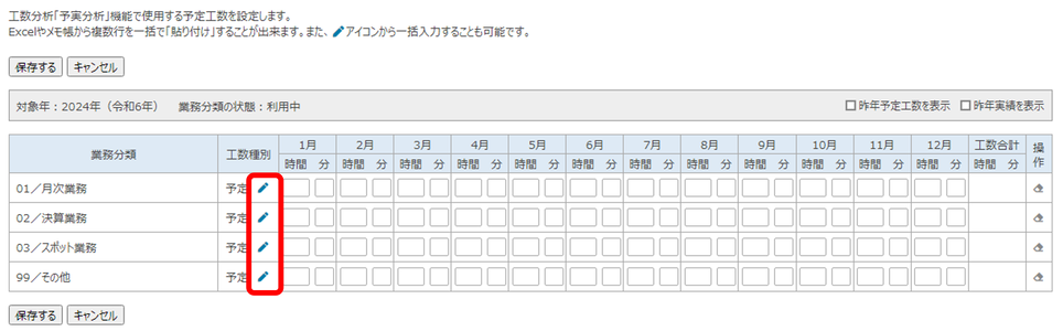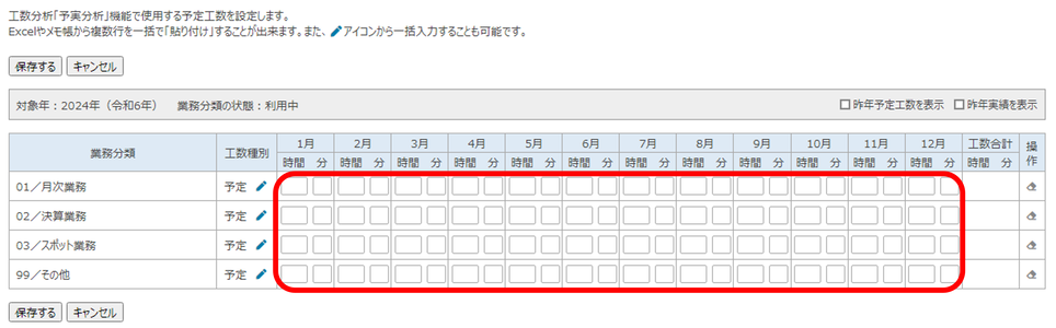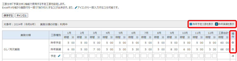 2)昨年予定工数を表示・昨年実績を表示より、転記