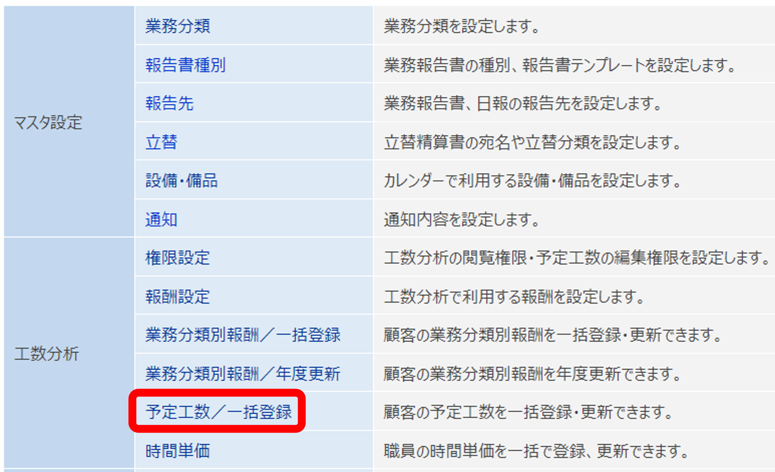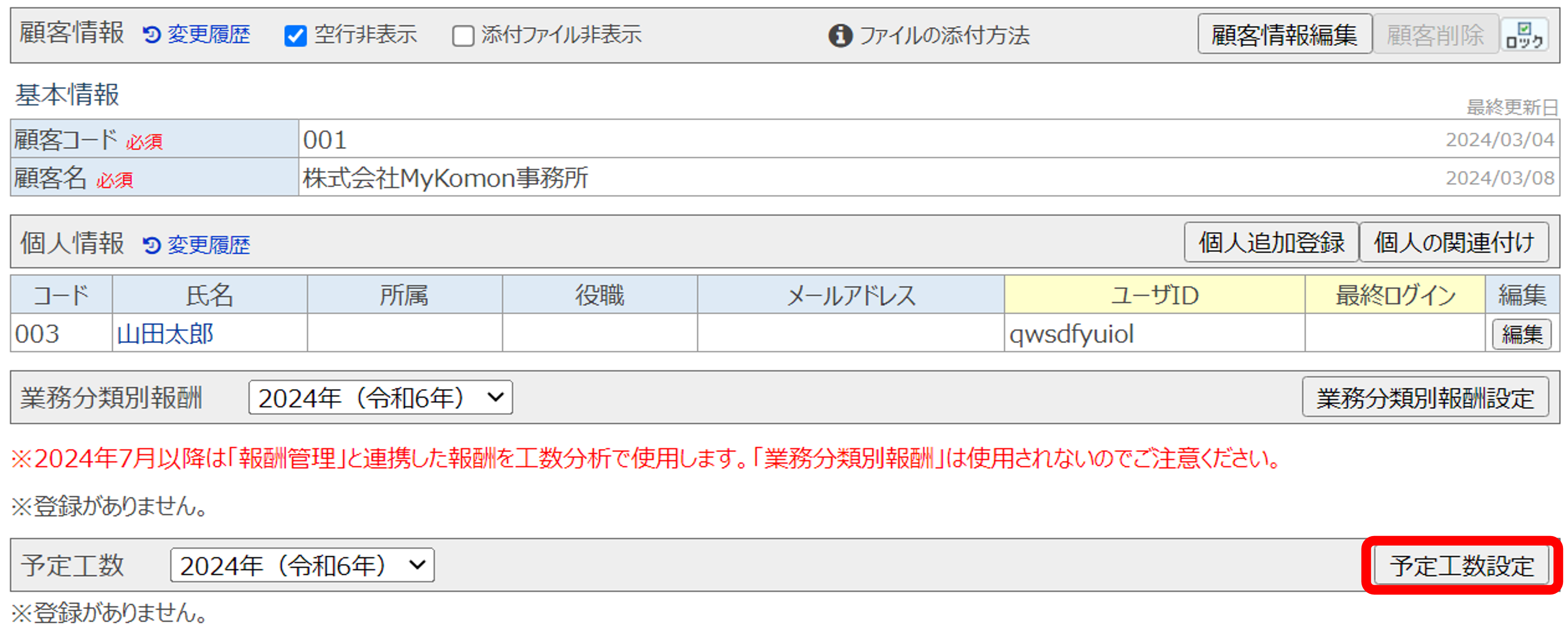 ②該当の顧客名をクリックし、「予定工数設定」をクリック