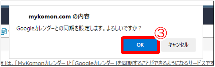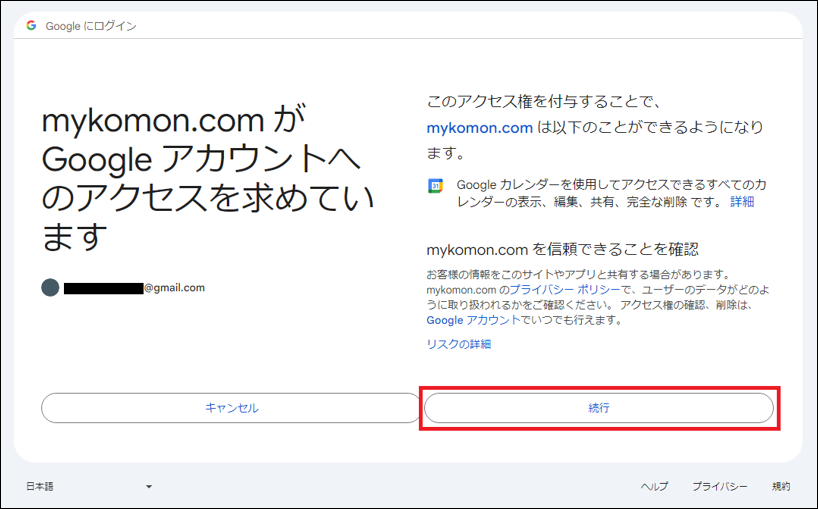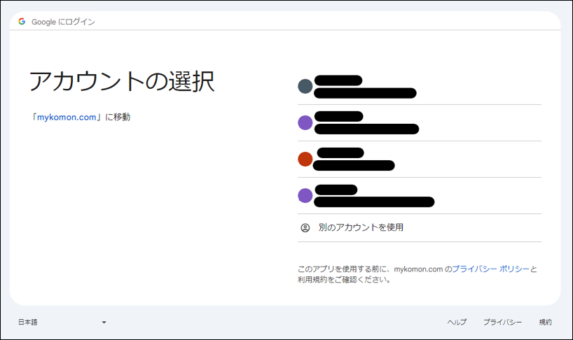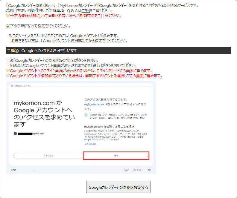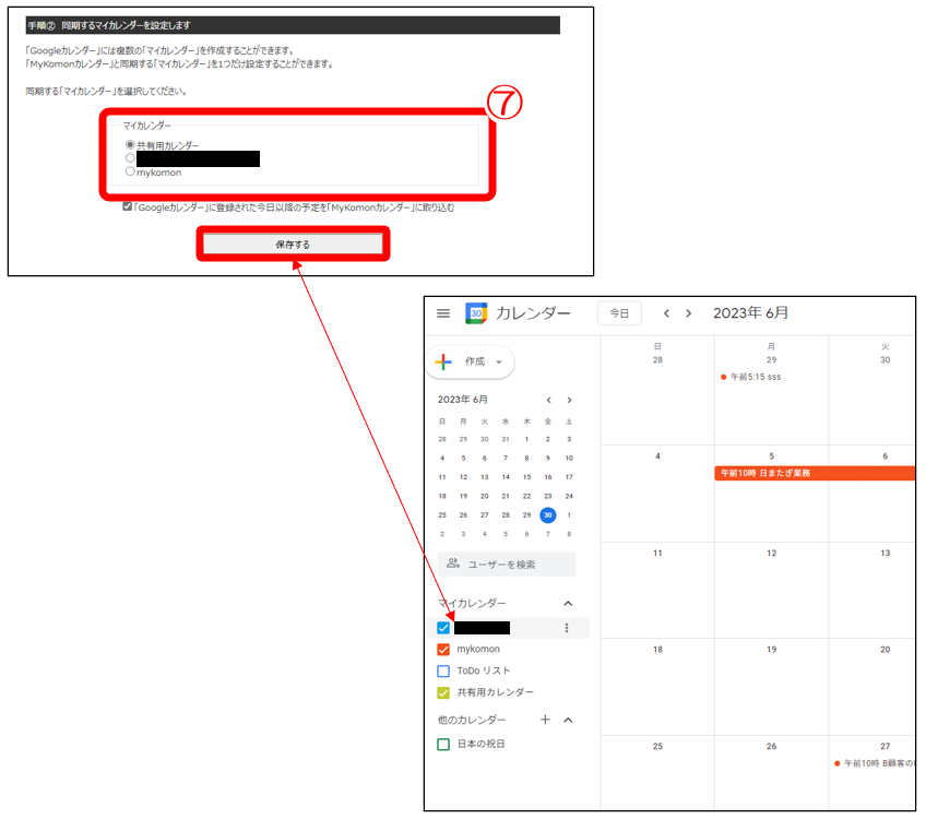 ④MyKomonと同期するGoogleカレンダーのアカウントを選択