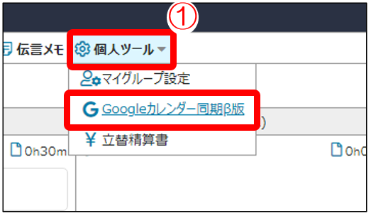 ①ホーム画面からグループウェアを開き、「個人ツール」>「Googleカレンダー同期β版」をクリック