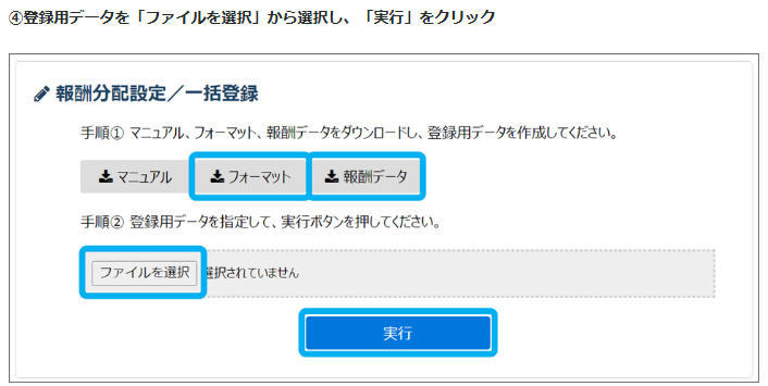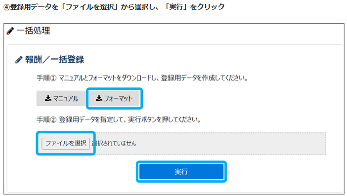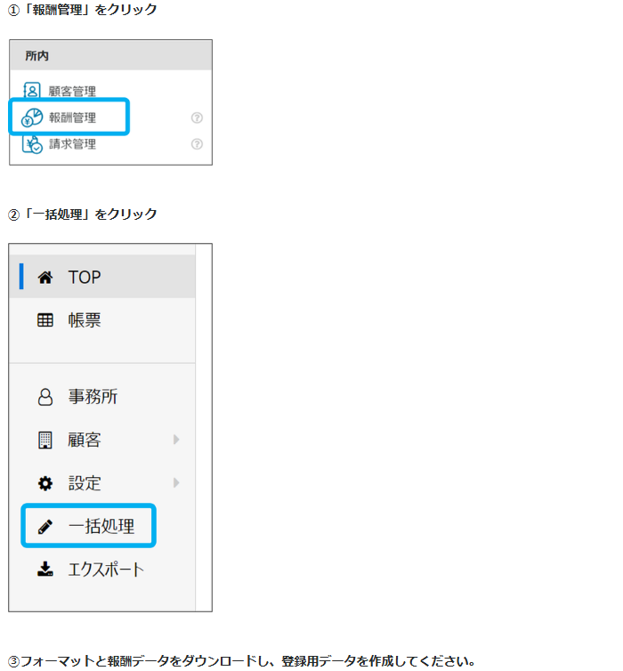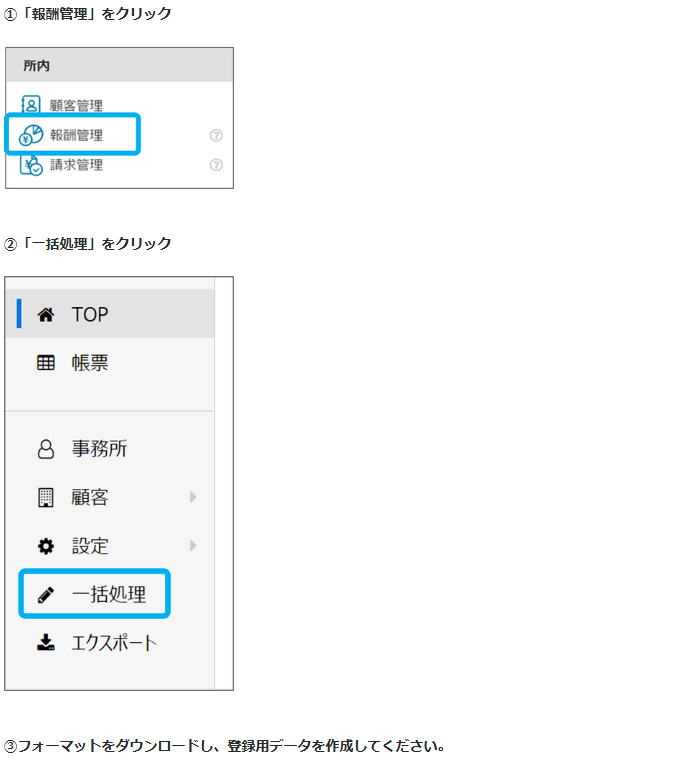 データの作成方法は、報酬管理インポートマニュアルをご覧ください。