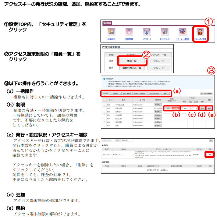 IT担当者権限の方がアクセスできなくなった場合は、所長権限にてアクセス端末制限の一時無効後、所長権限もしくはIT担当者権限にてアクセスキーの追加発行および設定を行ってください。