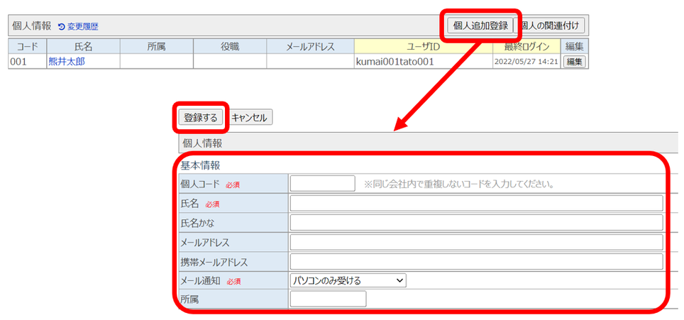 ④個人情報バーの右側にある「個人追加登録」をクリック