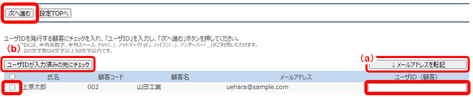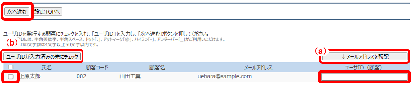 (a)メールアドレスを「ユーザID(顧客)」に転記することができます。
