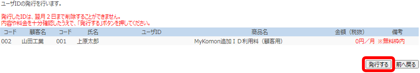 ⑦最終確認画面でIDの文字や金額などを確認し「発行する」をクリック