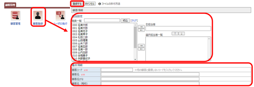 ③担当設定、顧客情報(顧客名、住所など)を入力し「登録する」をクリック