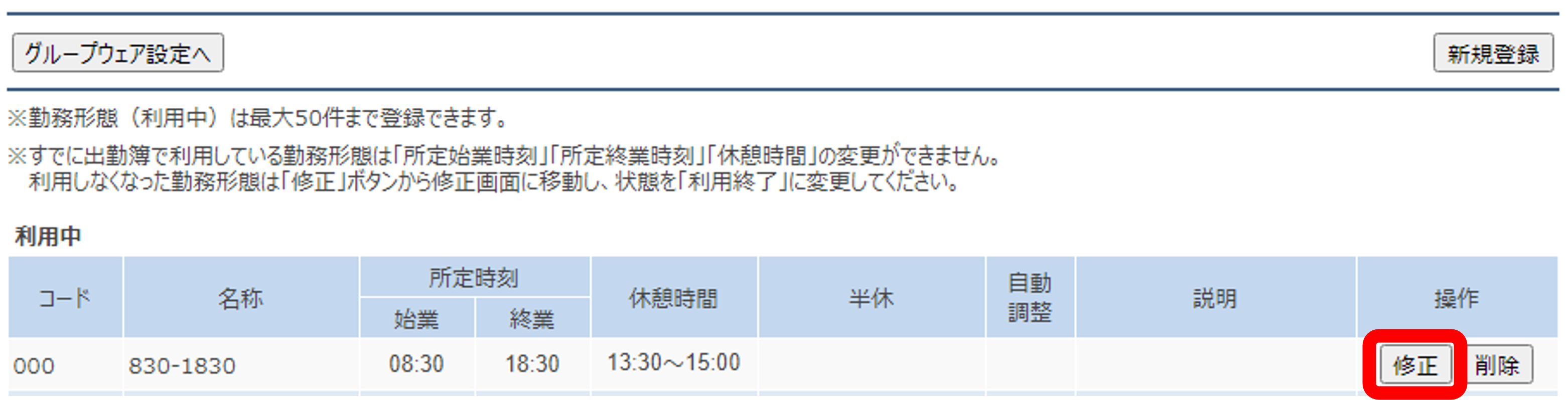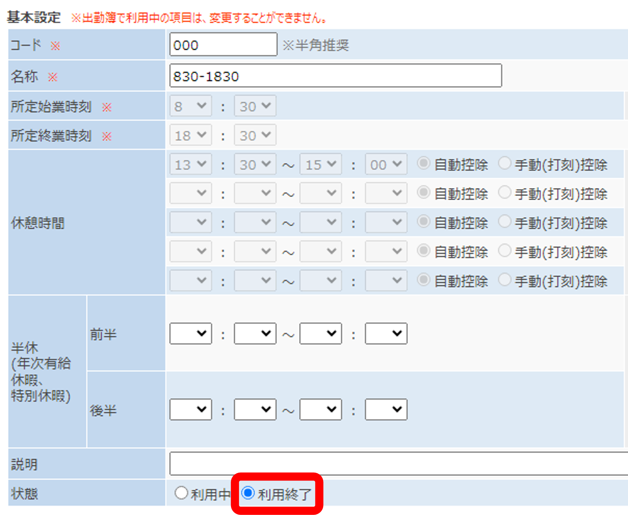すでに利用中の勤務形態を修正することはできません。