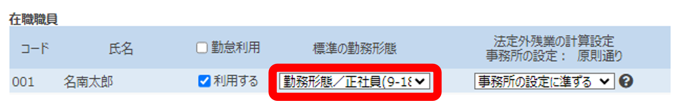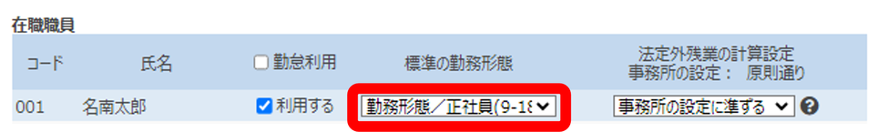 職員別設定で新たな勤務形態を選択すると、翌日以降の出勤簿より反映されます。