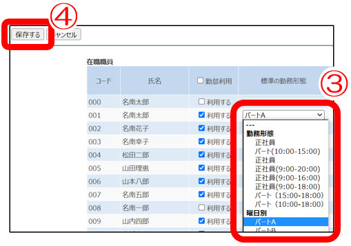 3)職員別設定で曜日別の勤務形態を登録