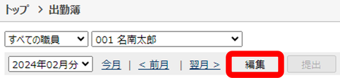 ③「編集」をクリック(他の人の出勤簿を編集する場合は、ロックをクリック後、編集をクリック)