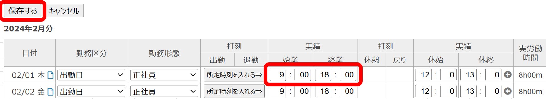④実績の時間を変更し、「保存する」をクリック