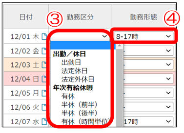 ③勤務区分を該当の有休の種類を選択