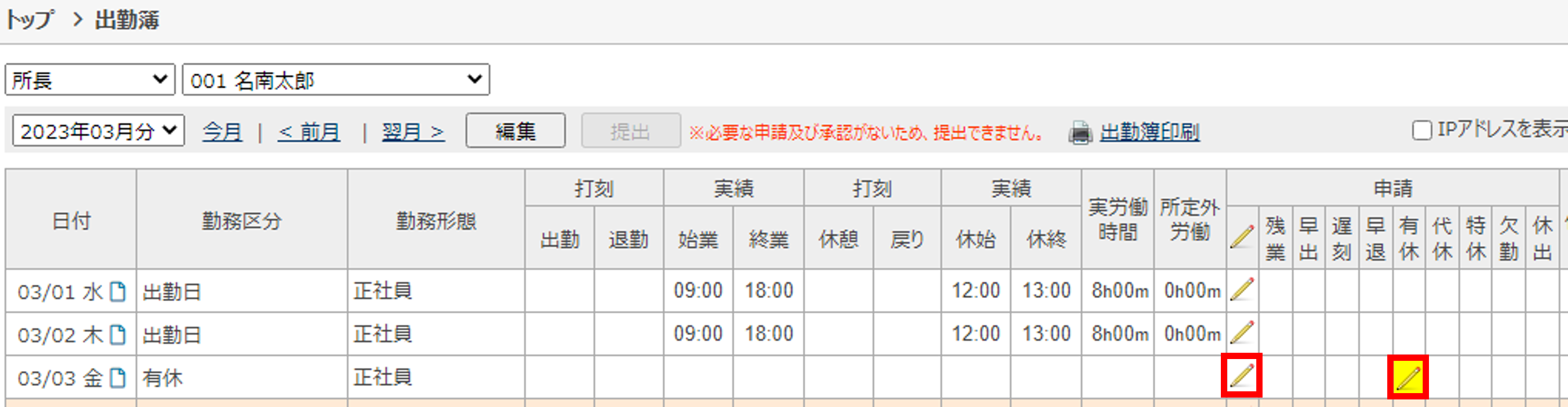「※必要な申請及び承認がないため、提出できません。」と表示され、出勤簿が提出・承認できません。