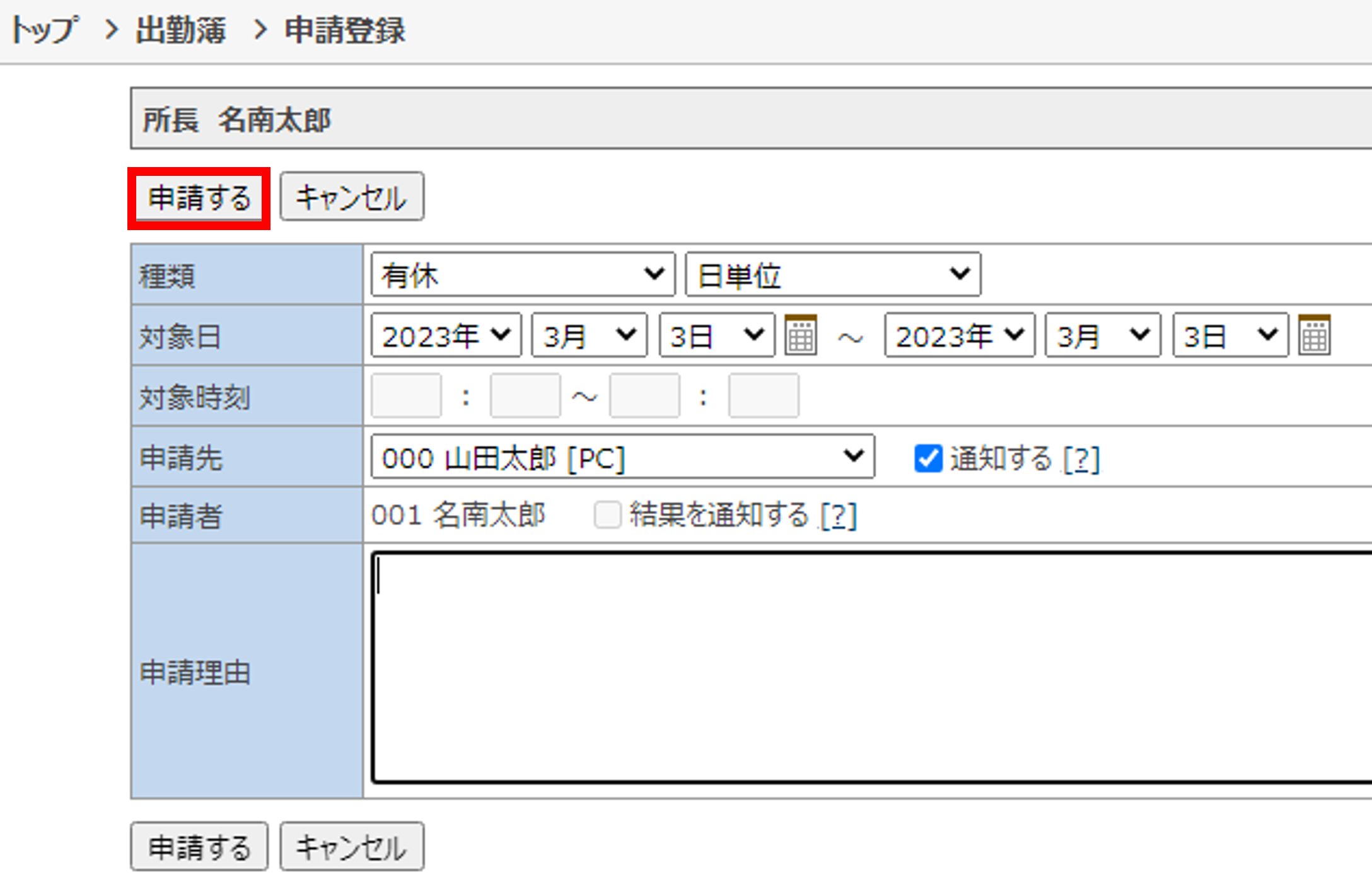 4.必要な申請の内容を入力し、「申請する」をクリック