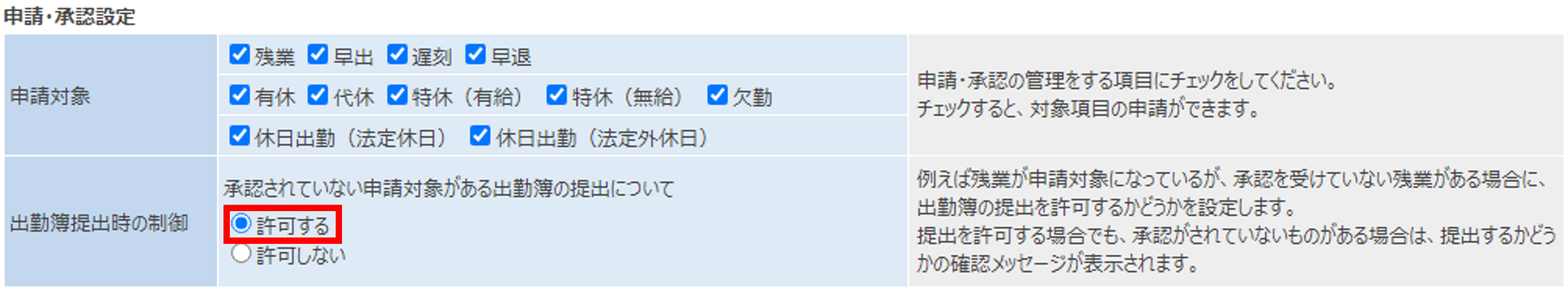 4.申請・承認設定内の「出勤簿提出時の制御」を、承認されていない申請対象がある出勤簿の提出について「許可する」にチェックを入れる