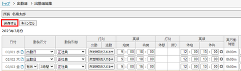 4.勤務区分や実績を変更し、「保存する」をクリック