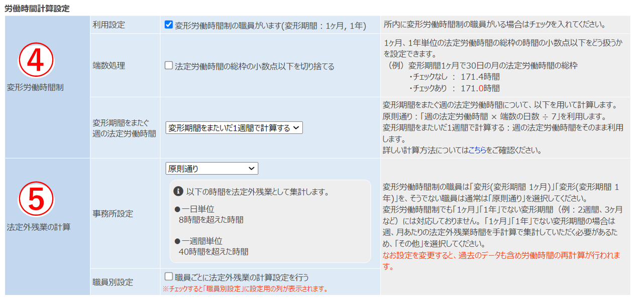 ⑤「法定外残業の計算」にて事務所様の計算方法に沿ったも内容を選択していただく