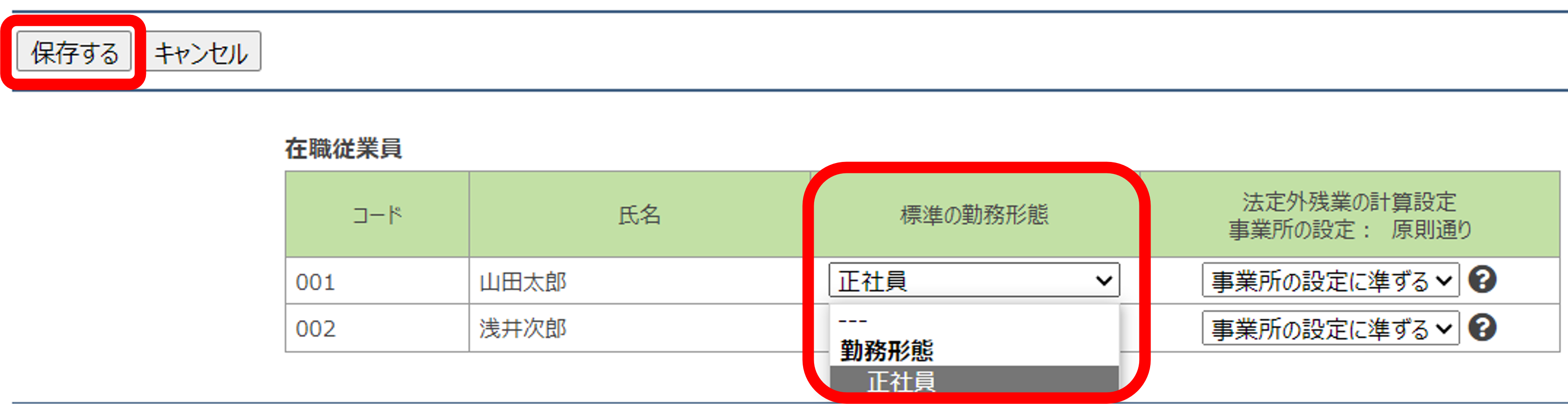 ④標準の勤務形態にて、1で作成した勤務形態を選択し、「保存する」をクリック