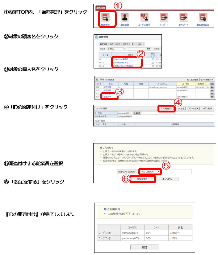 顧客ID(電子会議室、共有フォルダ、楽しい給与計算等)と従業員ID(勤怠、WEB明細)を