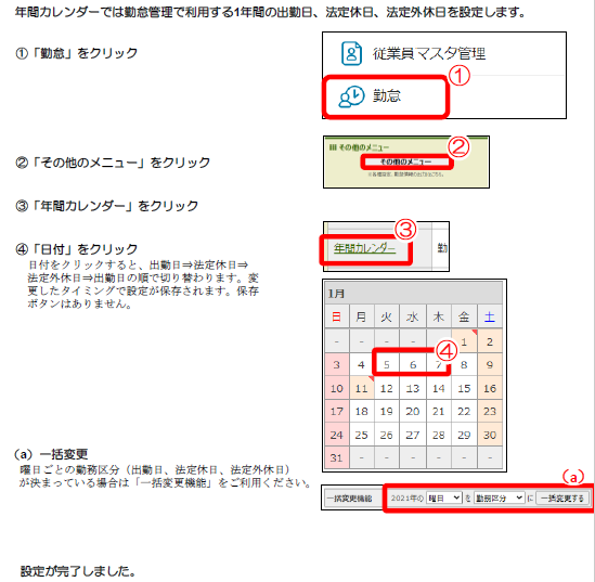 出勤簿の出勤日・法定外休日・法定休日を、一括で全員分変更できますか?