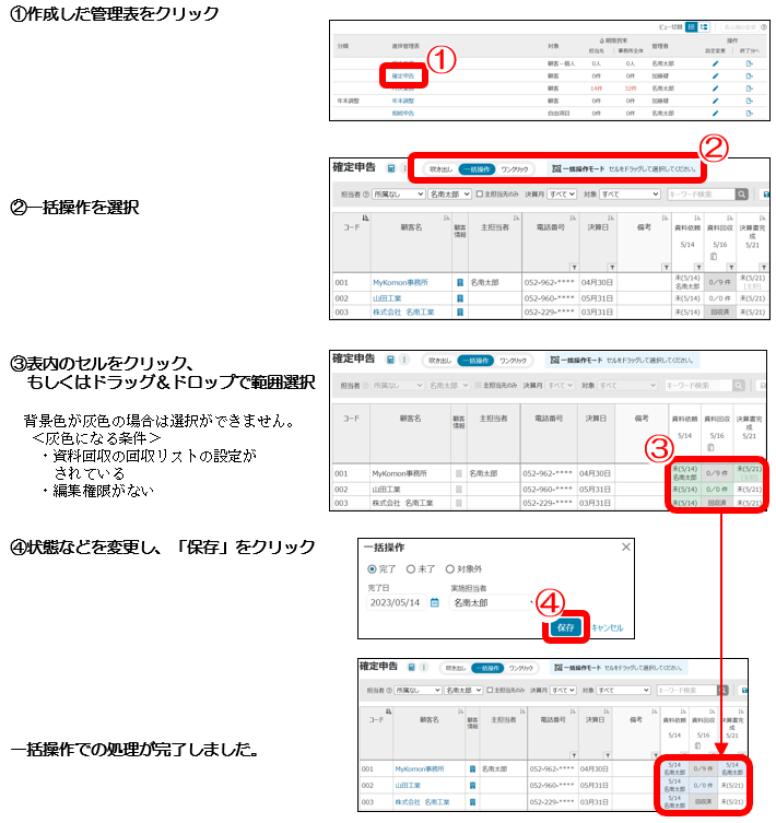 HOME よくあるご質問 進捗管理表 完了 複数の項目を一括で完了にしたいです。 進捗管理表の完了についてのよくあるご質問 複数の項目を一括で完了にしたいです。 以下の通りです。 0人の方の参考になっています。 この質問・回答は参考になりましたか? ご回答ありがとうございます はい いいえ よろしければ「いいえ」の理由をお聞かせください。今後の改善のため、具体的な理由を以下のコメント欄にご記入ください。※ご質問をいただいても個別での回答はできかねますのでご了承ください。 回答の内容がわかりにくい リンク先のサイトの内容がわかりにくい その他 よくあるご質問TOPへ お問い合わせはこちら 移転、事務所名変更などの情報変更もこちらからご依頼ください。 お問い合わせはこちら 情報変更依頼はこちら よくあるご質問 随時更新中! 詳しくみる 料金表 申込 契約情報変更