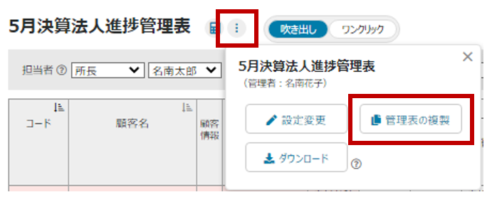 ③画面左上の「その他の機能」をクリックし、「管理表の複製」を選択