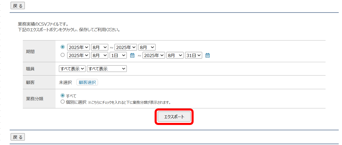 業務実績をエクセルファイルに出力し、その中で検索していただく方法になります。