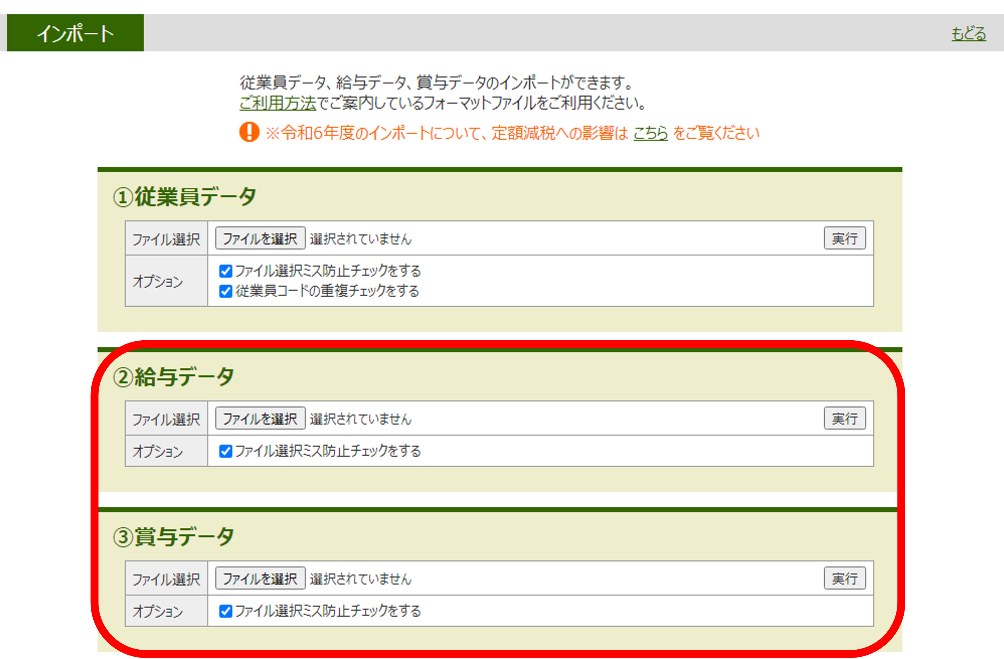 ⑨メンテナンスの箇所の「インポート」をクリックし、給与情報と賞与情報をインポート
