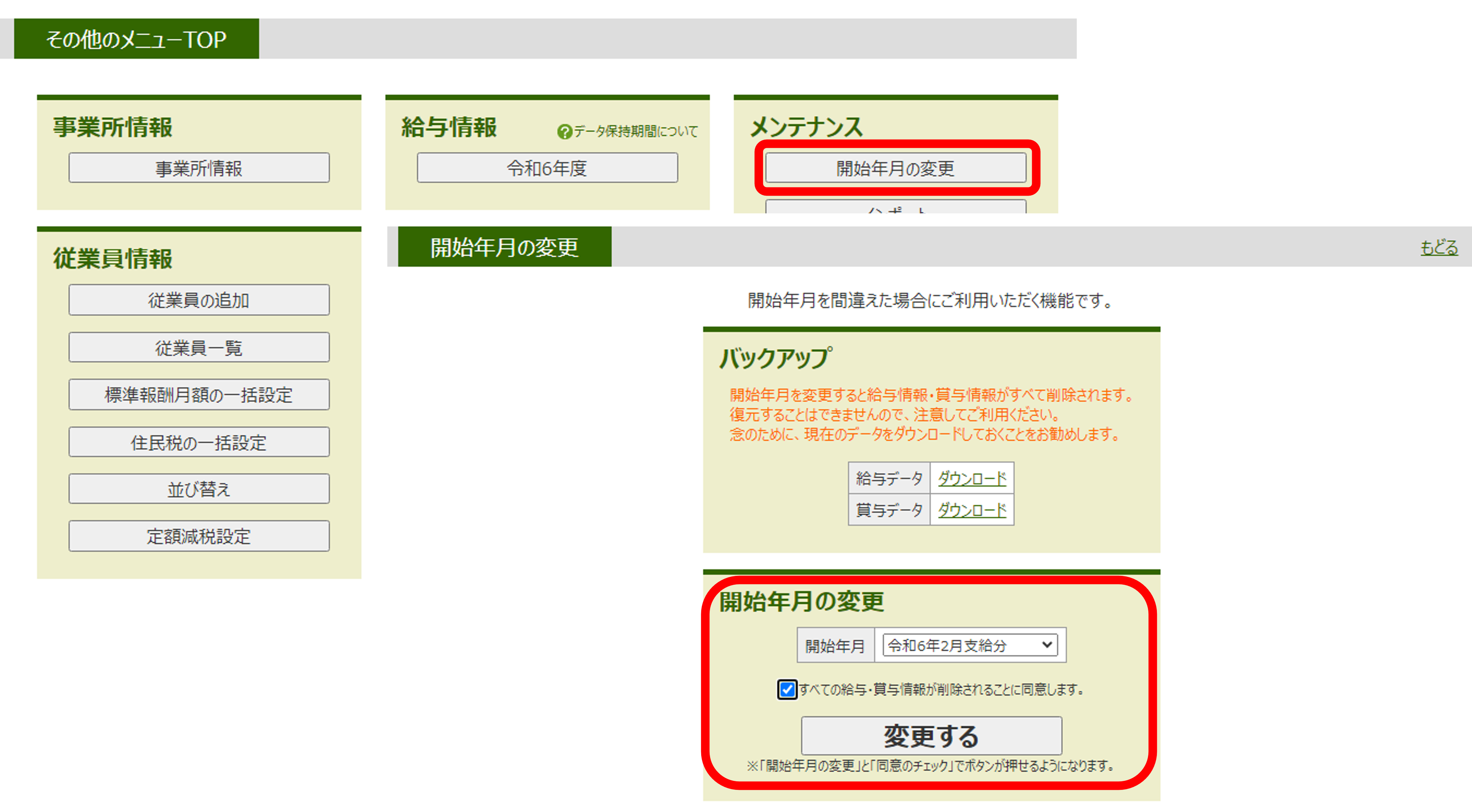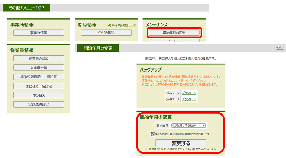 ⑦開始年月を変更後、「すべての給与・賞与情報が削除されることに同意します。」にチェックし、「変更する」をクリック