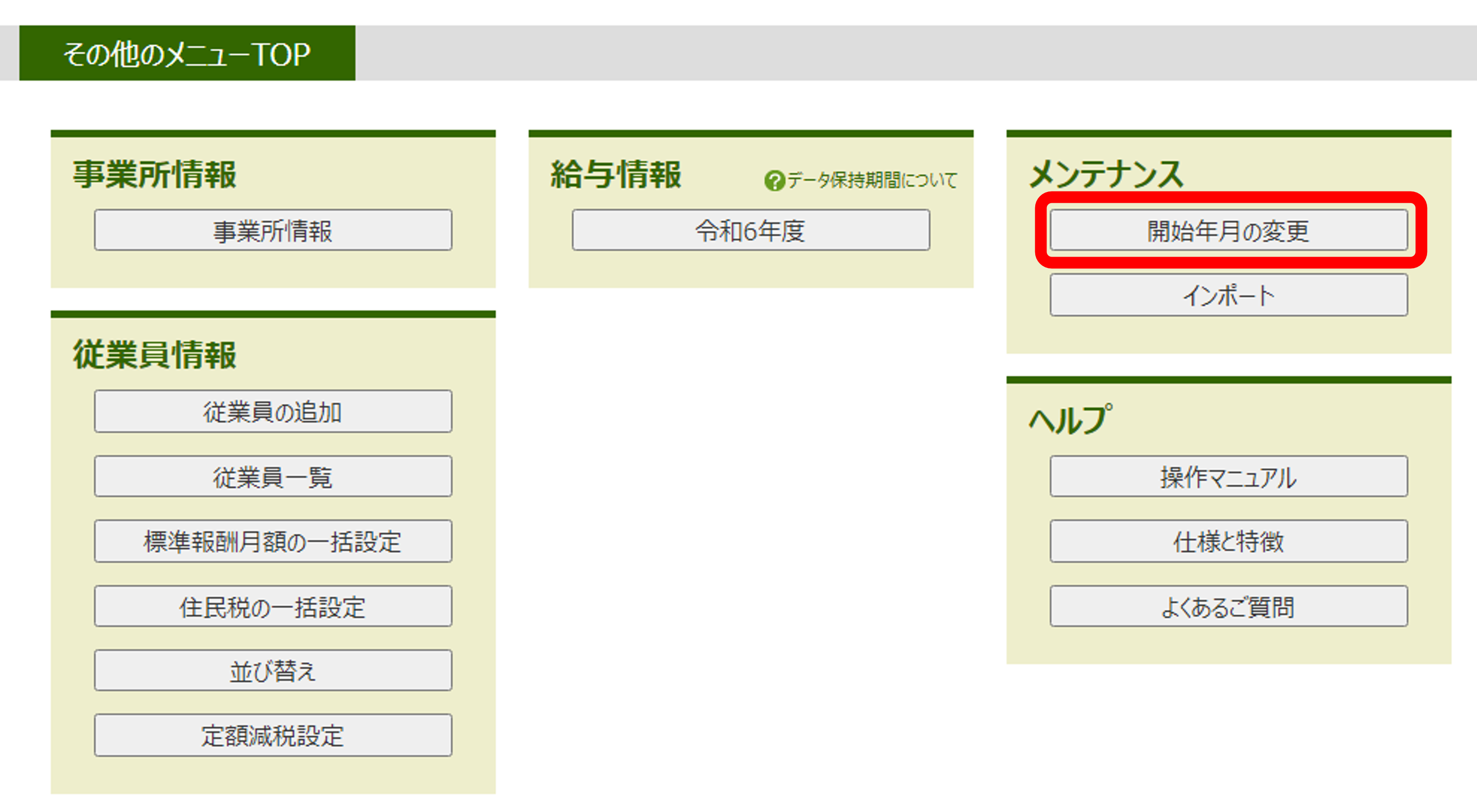 ②メンテナンスの箇所に「開始年月の変更」があるか確認