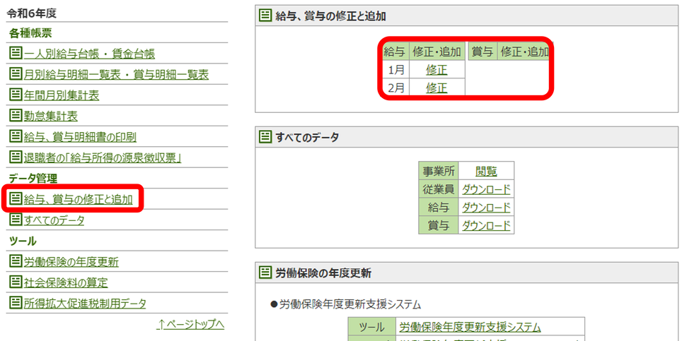 ⑤データ管理内の「給与、賞与の修正と追加」をクリックし、③でダウンロードした資料をもとに、それぞれの月に入力