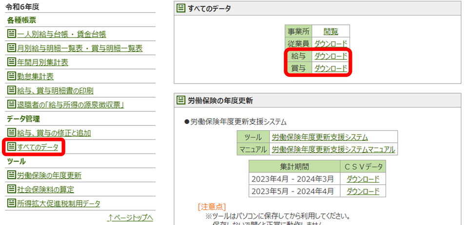 ④データ管理のすべてのデータをクリックし、給与と賞与のダウンロードをクリック