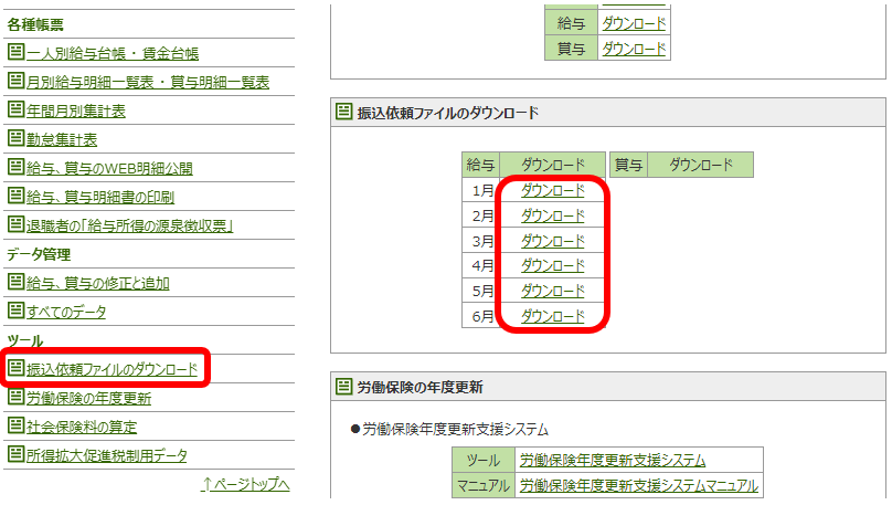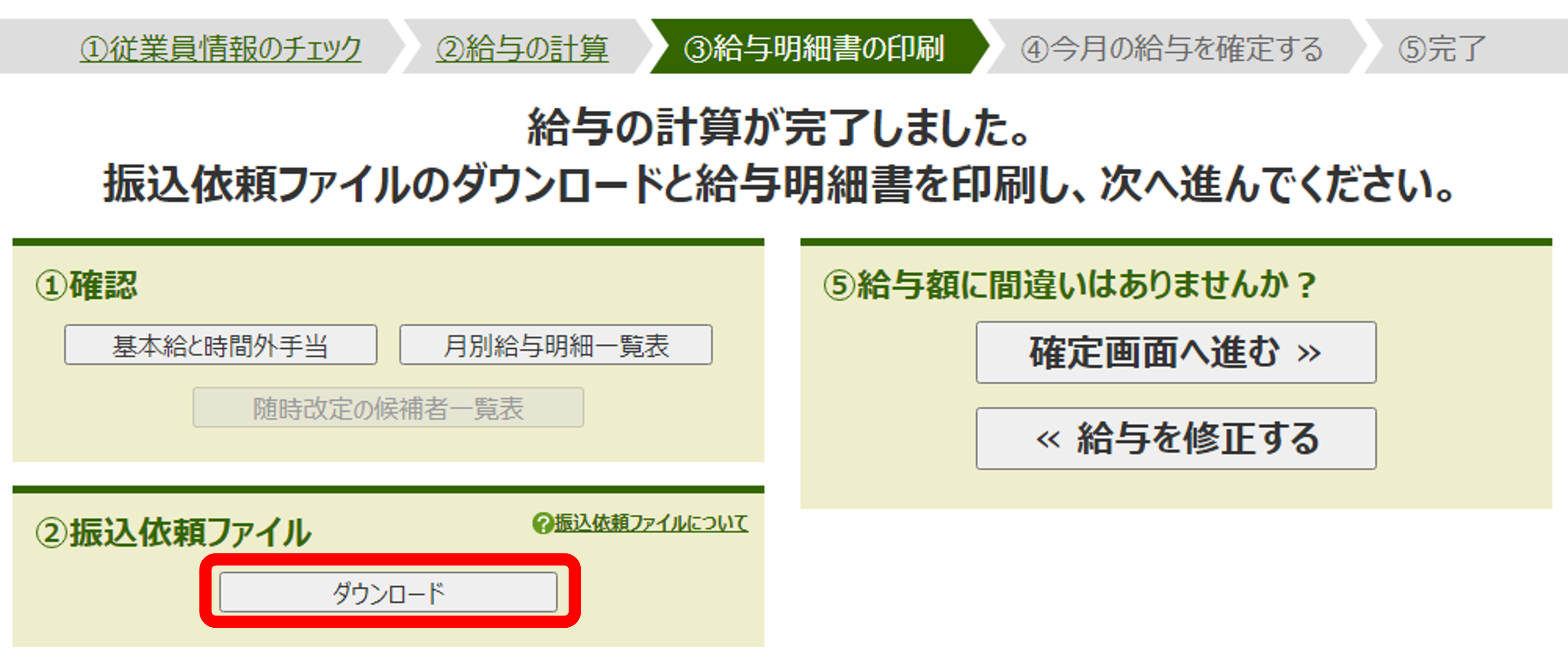 ④「③給与明細書の印刷」にて「②振込依頼ファイル」のダウンロードをクリック