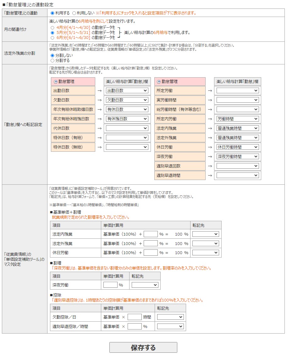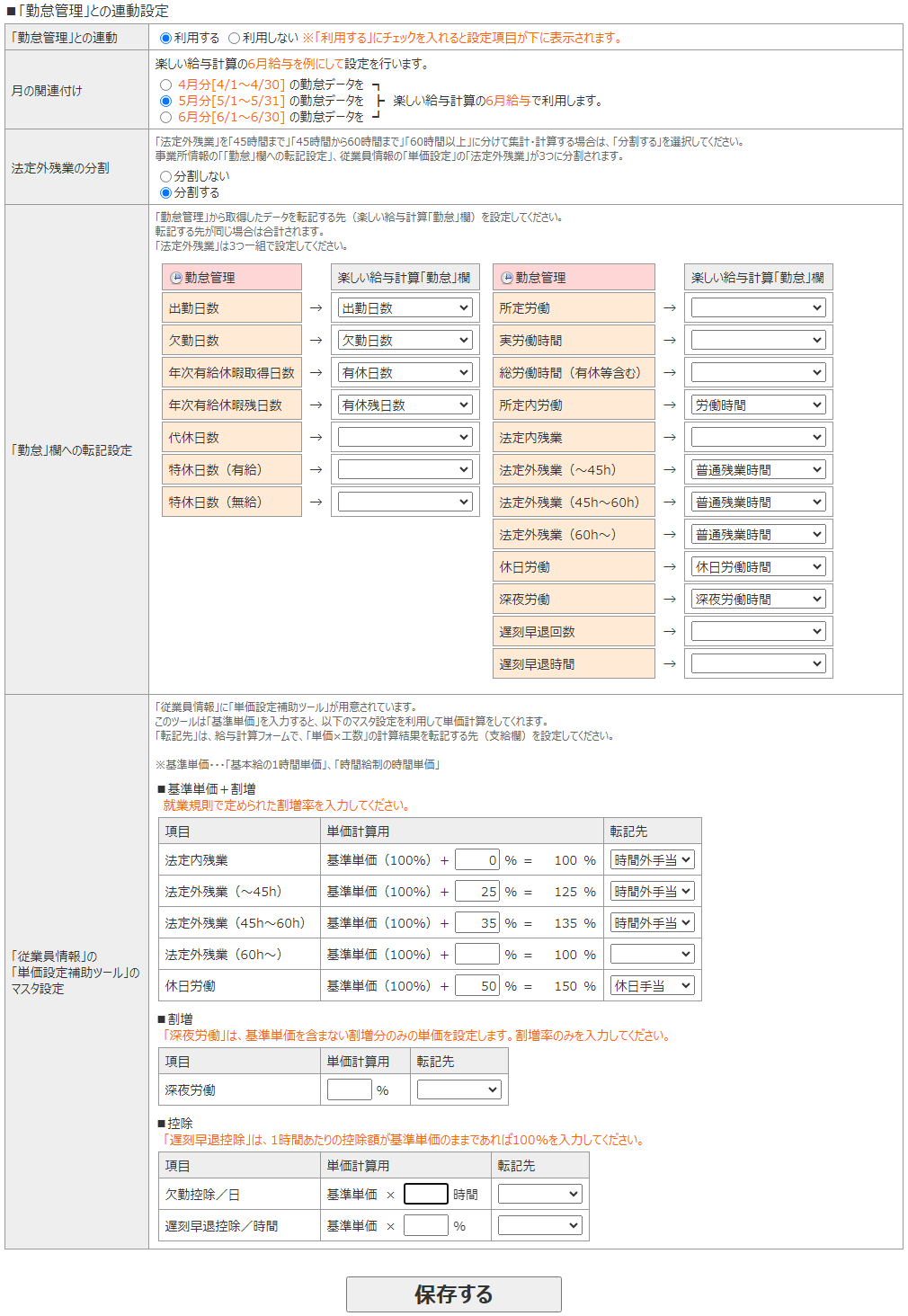 ④月の関連付け~「従業員情報」の「単価設定補助ツール」のマスタ設定までの設定を行い、「保存する」をクリック