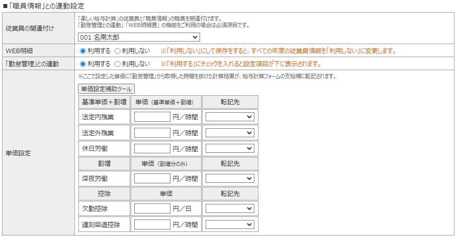 ⑤■「職員情報」との連動設定の「勤怠管理」との連動の「利用する」にチェック