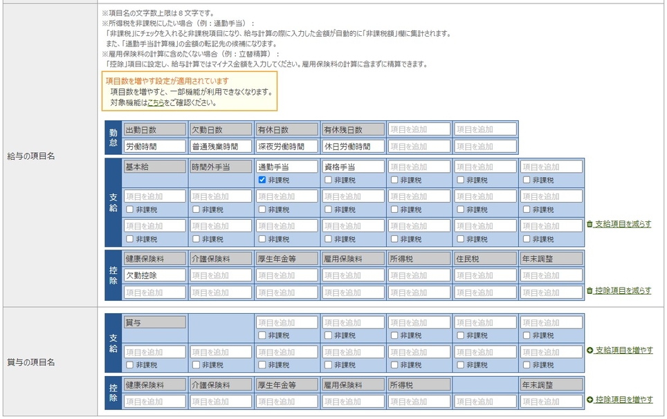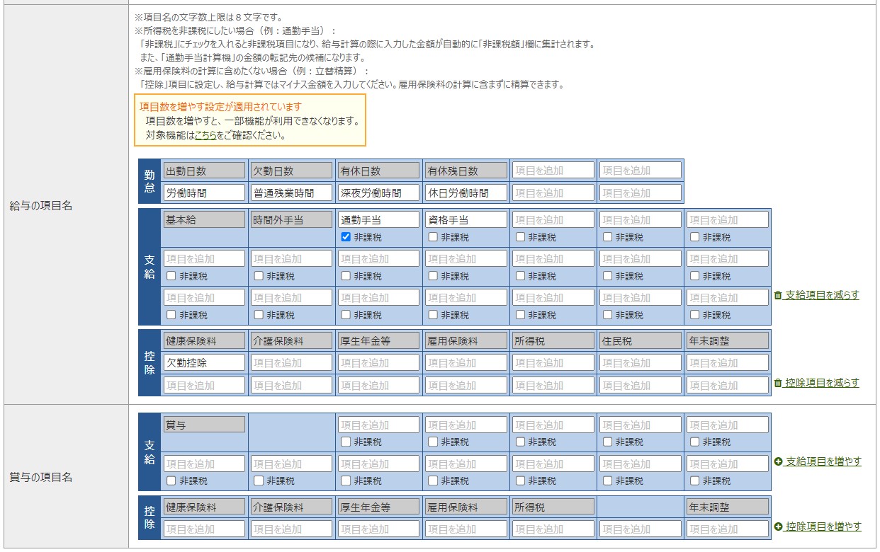 なお追加できる項目数は、支給項目⇒19個、控除項目⇒14個です。