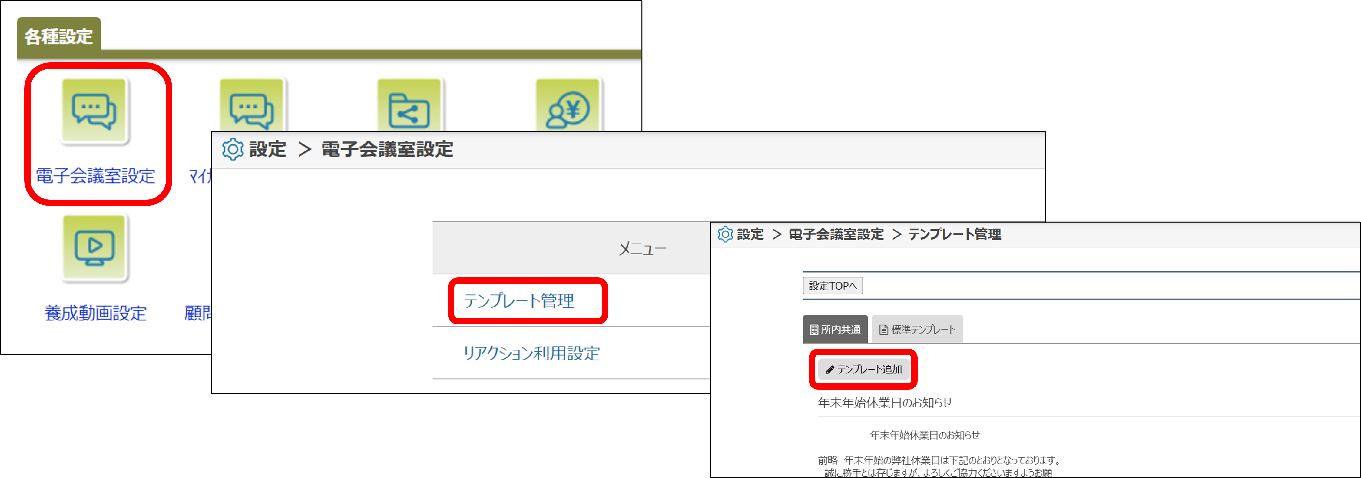 1)右上歯車マーク(設定)を開き、「電子会議室設定」をクリック