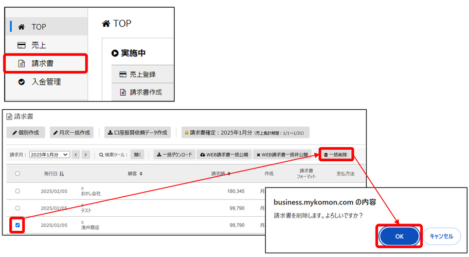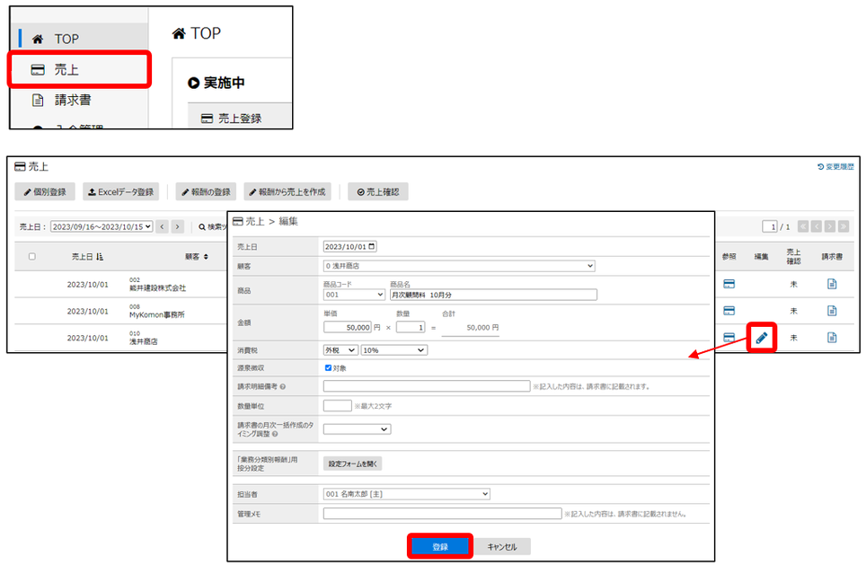 HOME よくあるご質問 請求管理 売上 売上が編集できません 請求管理の売上についてのよくあるご質問 売上が編集できません 以下の通りです。 0人の方の参考になっています。 請求書が発行された売上は編集することができません。 請求書を削除すると編集することができます。 請求書の削除 ①「請求書」をクリック ②該当の請求書にチェックを入れる ③一括削除をクリック ④「OK」をクリック 売上の編集 ⑤「売上」をクリック ⑥該当の売上の「編集」をクリック ⑦編集をし、「登録」をクリック 請求書の削除ができない場合はコチラをご確認ください。 請求書の削除ができない場合はコチラをご確認ください。 この質問・回答は参考になりましたか? ご回答ありがとうございます はい いいえ よろしければ「いいえ」の理由をお聞かせください。今後の改善のため、具体的な理由を以下のコメント欄にご記入ください。※ご質問をいただいても個別での回答はできかねますのでご了承ください。 回答の内容がわかりにくい リンク先のサイトの内容がわかりにくい その他 他のよくあるご質問 毎月定額の売上を手間なく作成できますか? 商品のフォーマットを予め作成できますか? 「報酬から作成した売上の取消」ボタンが表示されて、今月の売上を作成できません。 売上の値引きがある場合どのようにしたらいいですか? よくあるご質問TOPへ お問い合わせはこちら 移転、事務所名変更などの情報変更もこちらからご依頼ください。 お問い合わせはこちら 情報変更依頼はこちら よくあるご質問 随時更新中! 詳しくみる 料金表 申込 契約情報変更