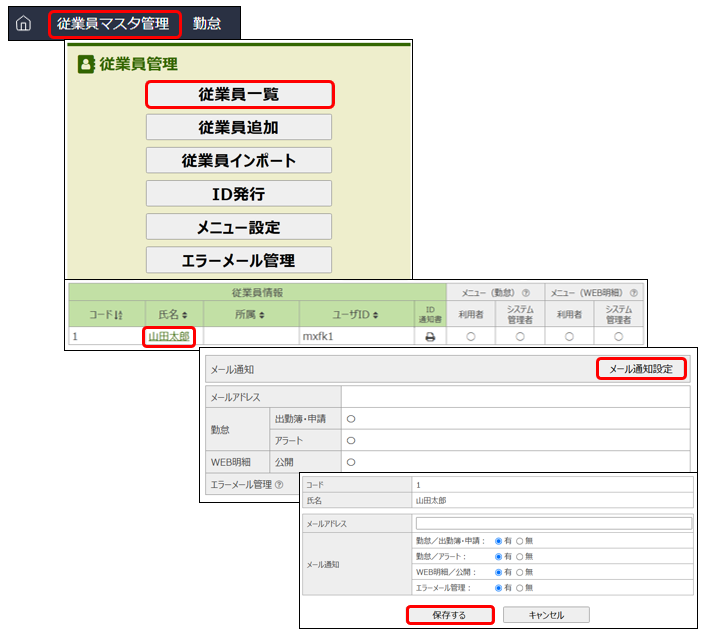 ④メール通知設定>メール通知:WEB明細/公開で「有」を選択し保存