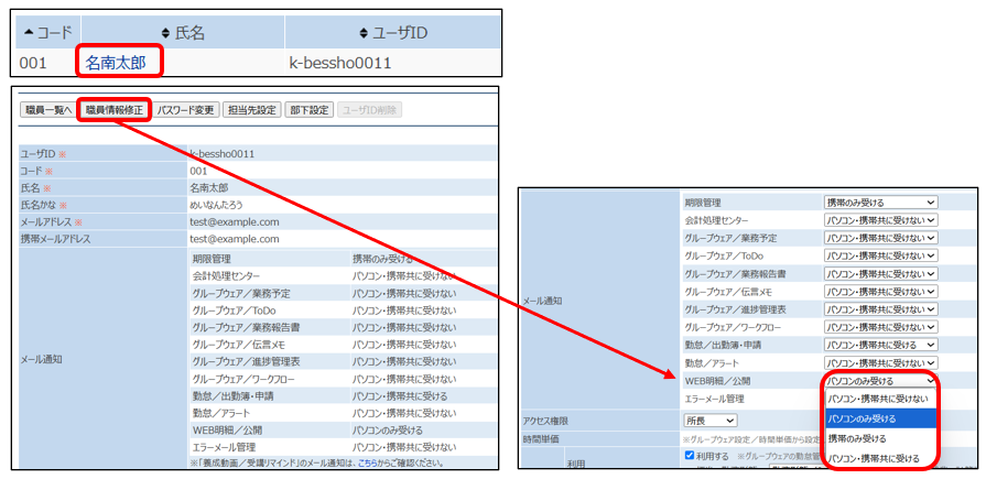 ※職員情報修正画面にて、メールアドレスもしくは携帯メールアドレスの入力が必要です。