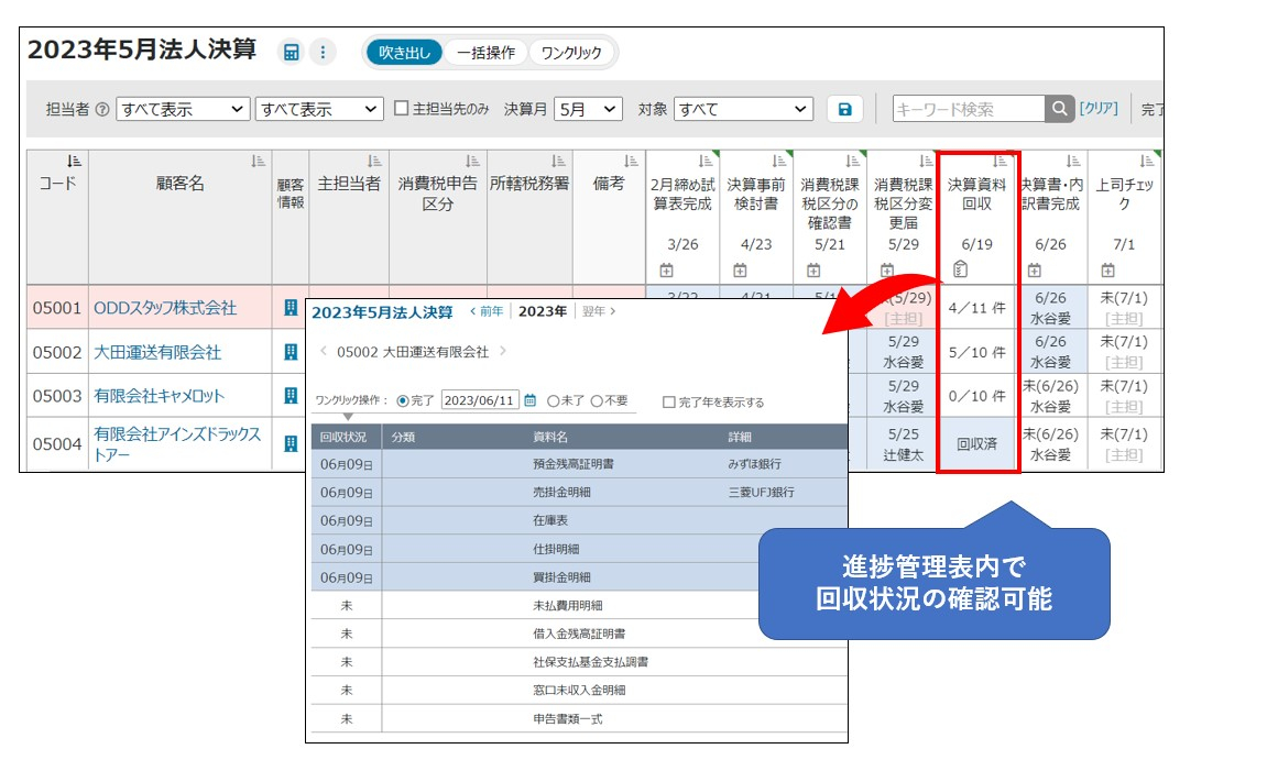 顧客ごとに資料の回収状況を見える化できる機能です。