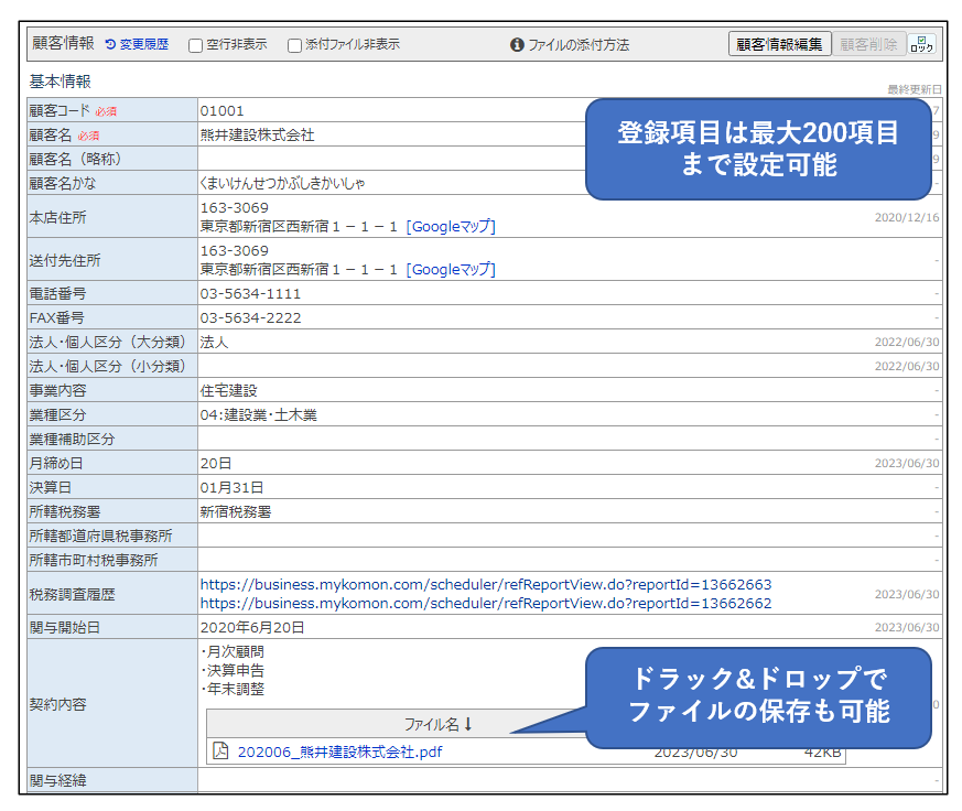 顧問先の住所や電話番号の確認、過去の相談対応などもサッと確認できます。