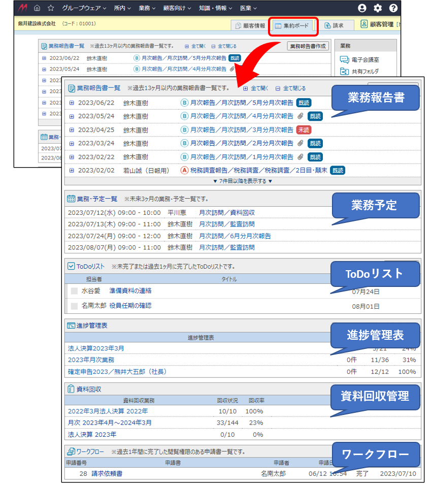 「集約ボード」を見れば、顧客ごとに報告書や今後のスケジュール、ToDoリストなどを一覧で確認できます。