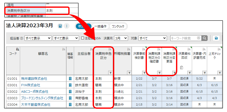 進捗管理表に来期の消費税区分を確認する項目を作成し、顧客管理から消費税申告区分を表示させます。