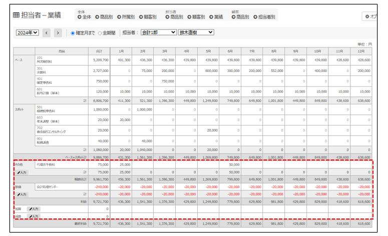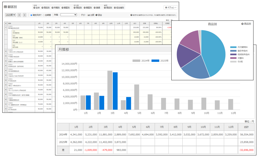 登録した報酬は、商品別・担当者別・顧客別など様々な角度で分析することができます。