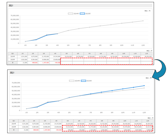 未来の報酬を登録し、集計期間を調整することで、今期の報酬の着地予想を確認することができます。