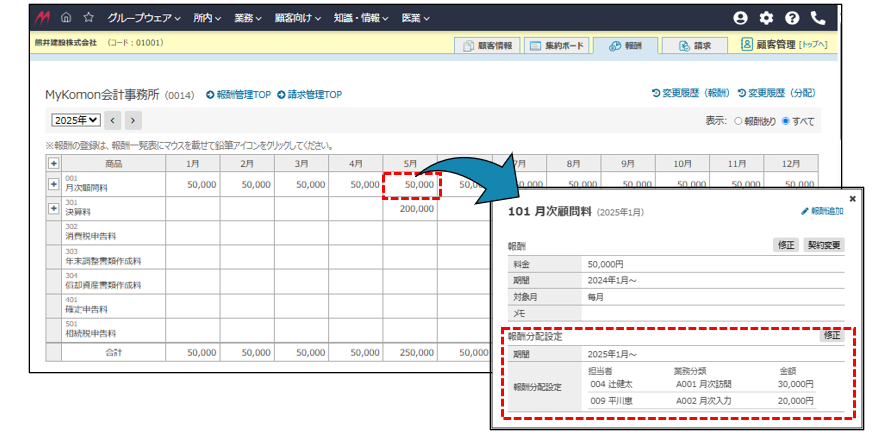 顧客管理に報酬を登録することができます。報酬は担当者ごとに自由に按分登録することが可能です。