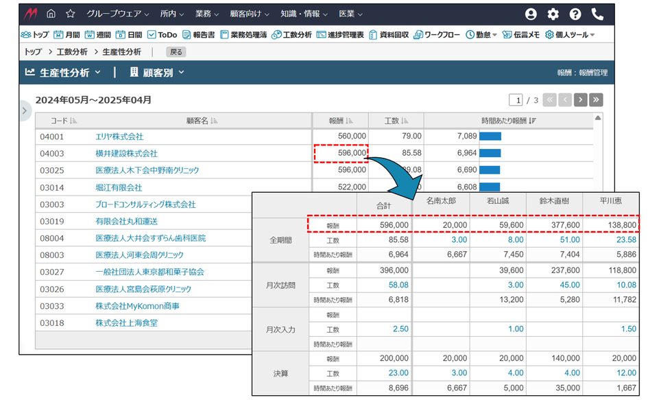 登録した報酬は工数分析に連動することができます。一顧客に複数担当者が関わるケースでも、報酬を按分登録できるため担当者ごとの成果を見える化できます。