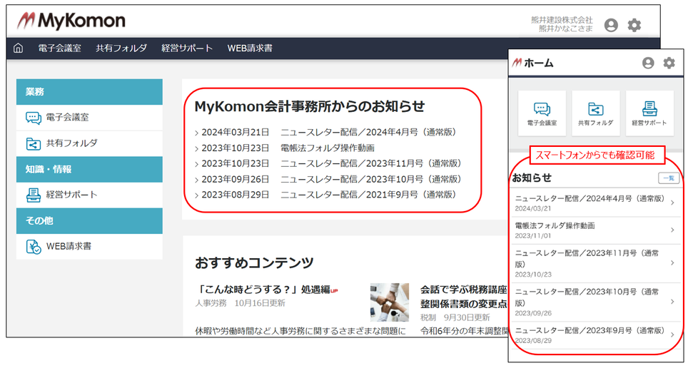 顧問先とのやり取りをMyKomonで一元化することで、顧問先は勿論、所内の情報共有の効率化も可能です。