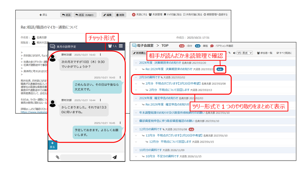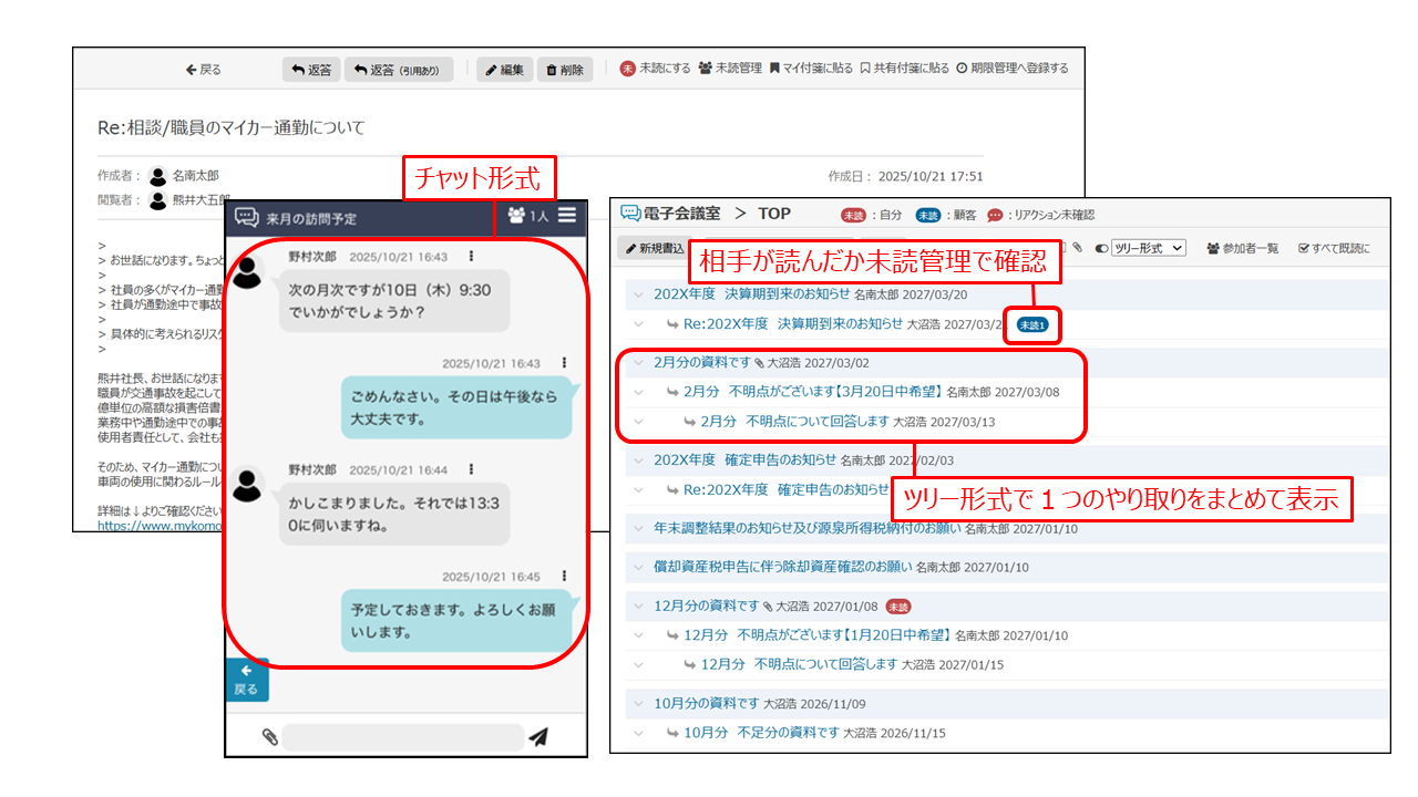 顧問先とのやり取りがMyKomon上に蓄積されるので、担当変更しても過去のやり取りが共有できます。